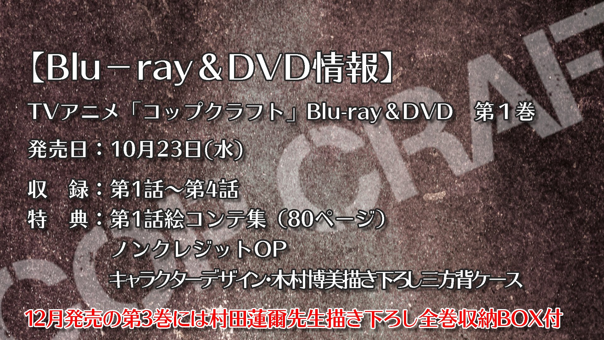 また、10月23日にはTVアニメ「コップクラフト」のBlu-ray&DVD第1巻が発売決定!11月20日には第2巻、12月20日には第3巻が発売予定で、購入特典で第1話絵コンテ集(80ページ)や映像特典でノンクレジットOPなど、そしてキャラクターデザイン・木村博美描き下ろし三方背ケースなども付いてきますので、気になる方は是非詳細をご確認してみて下さい!!